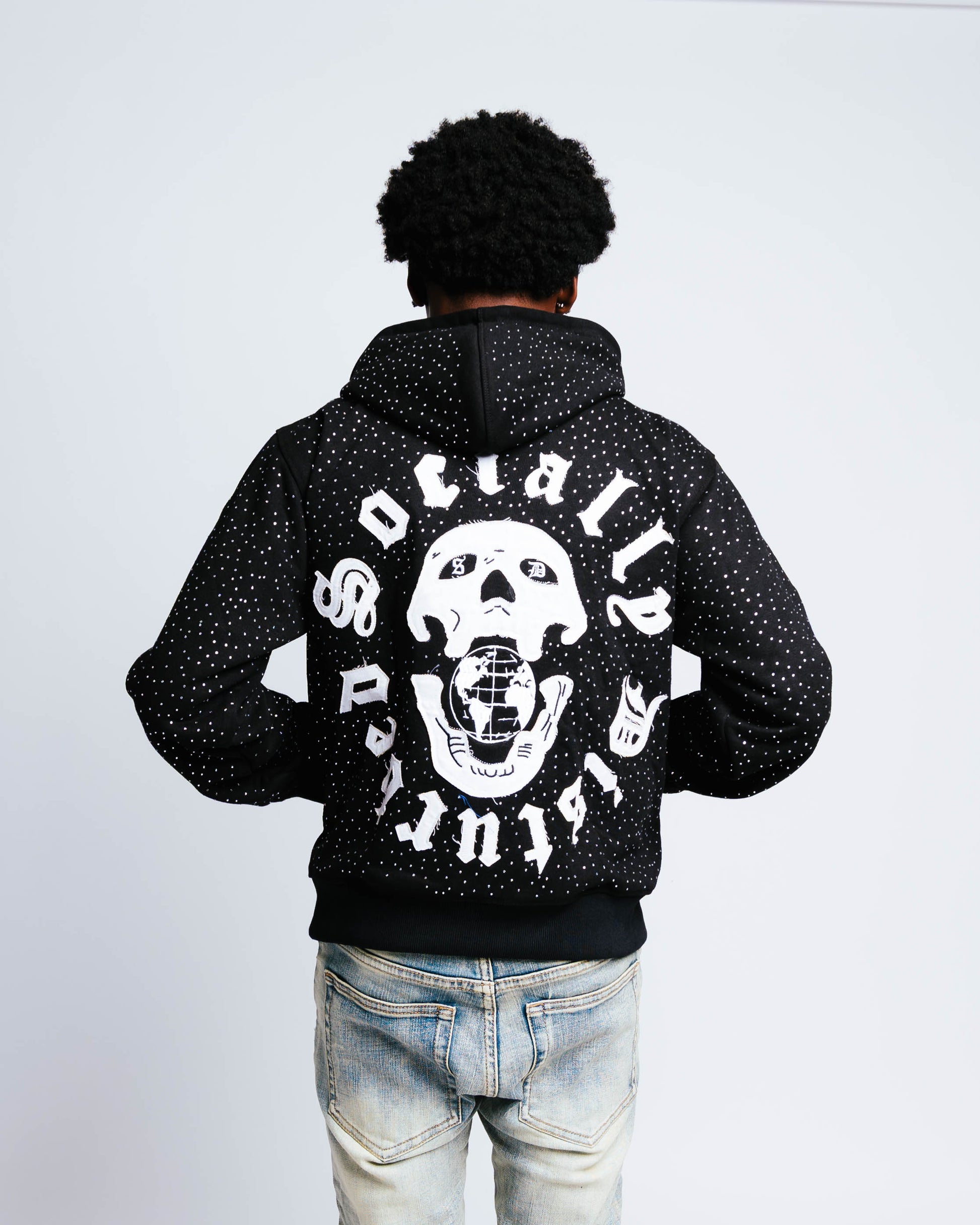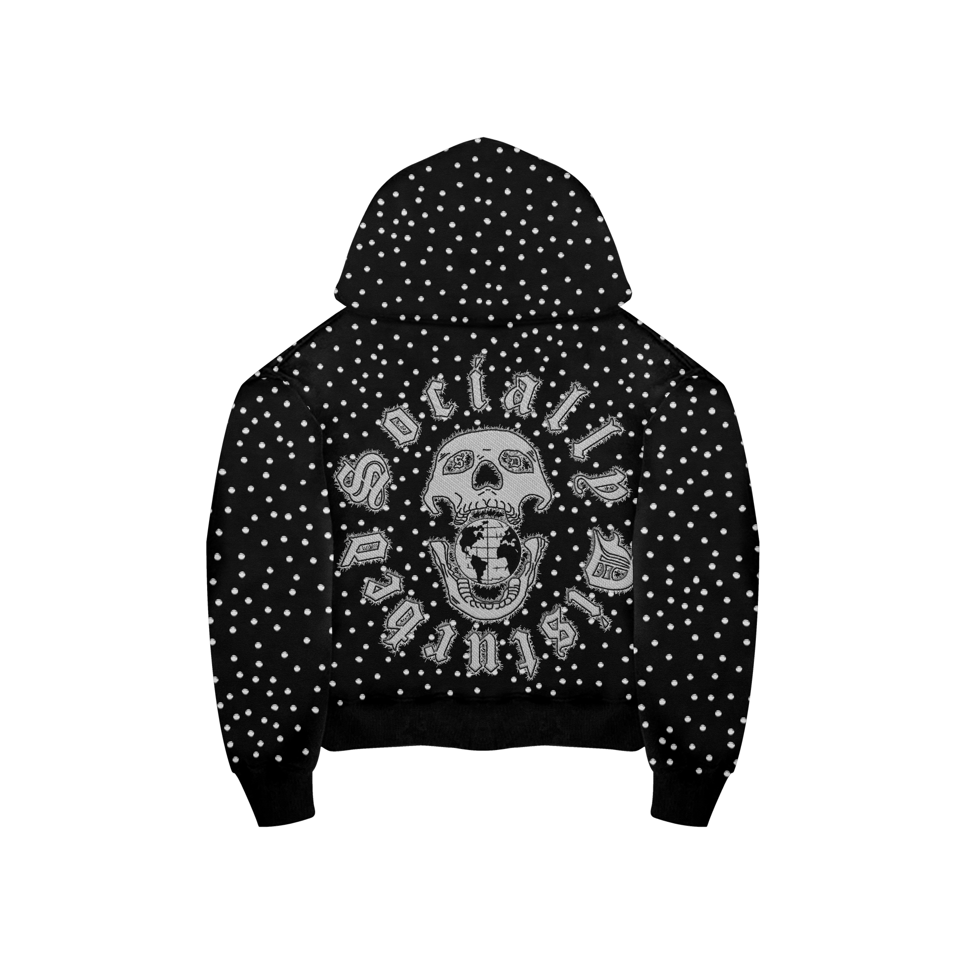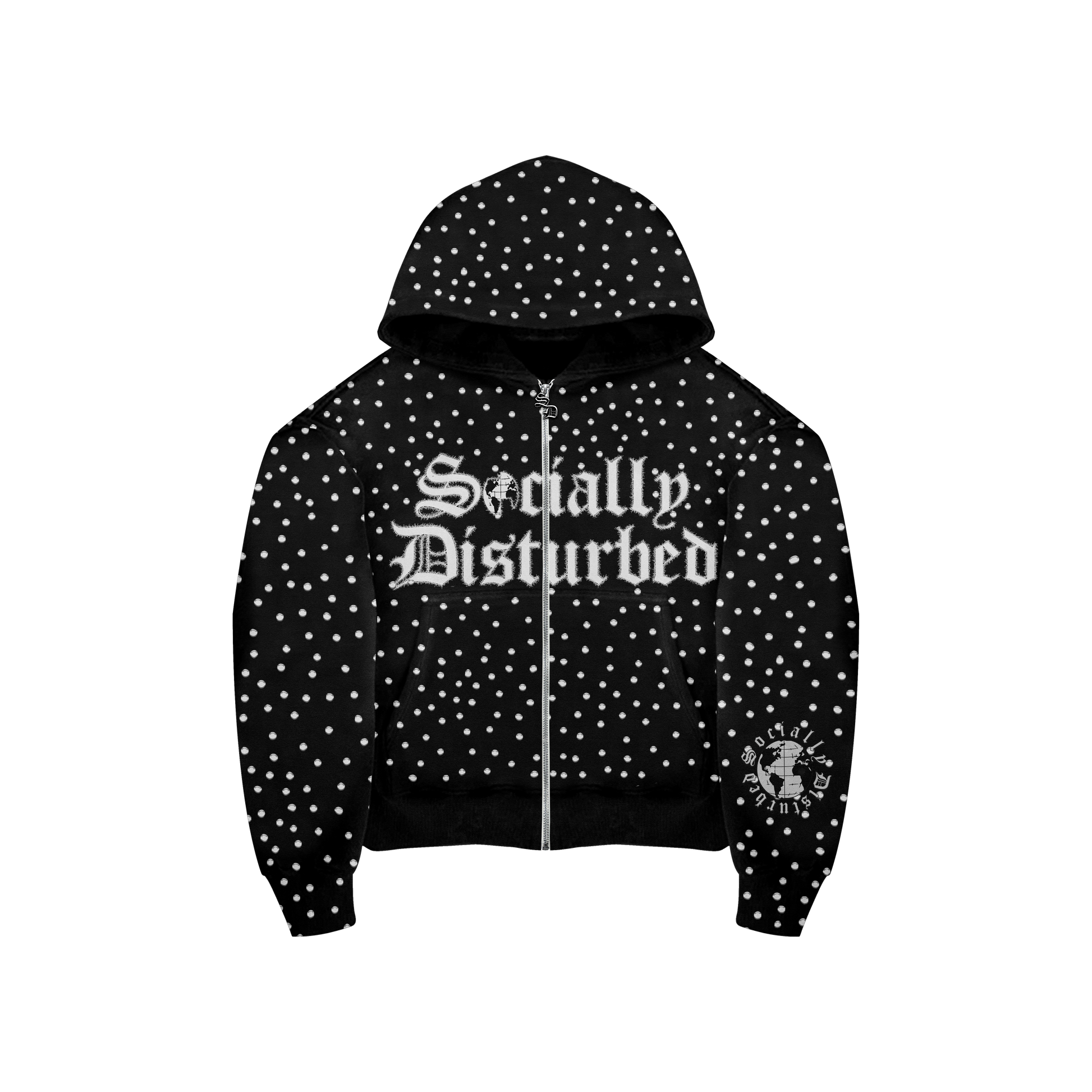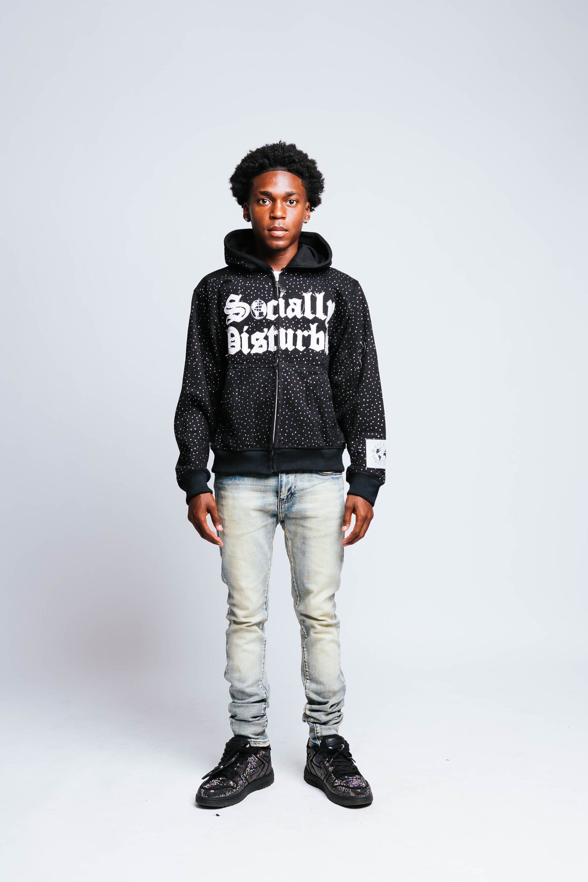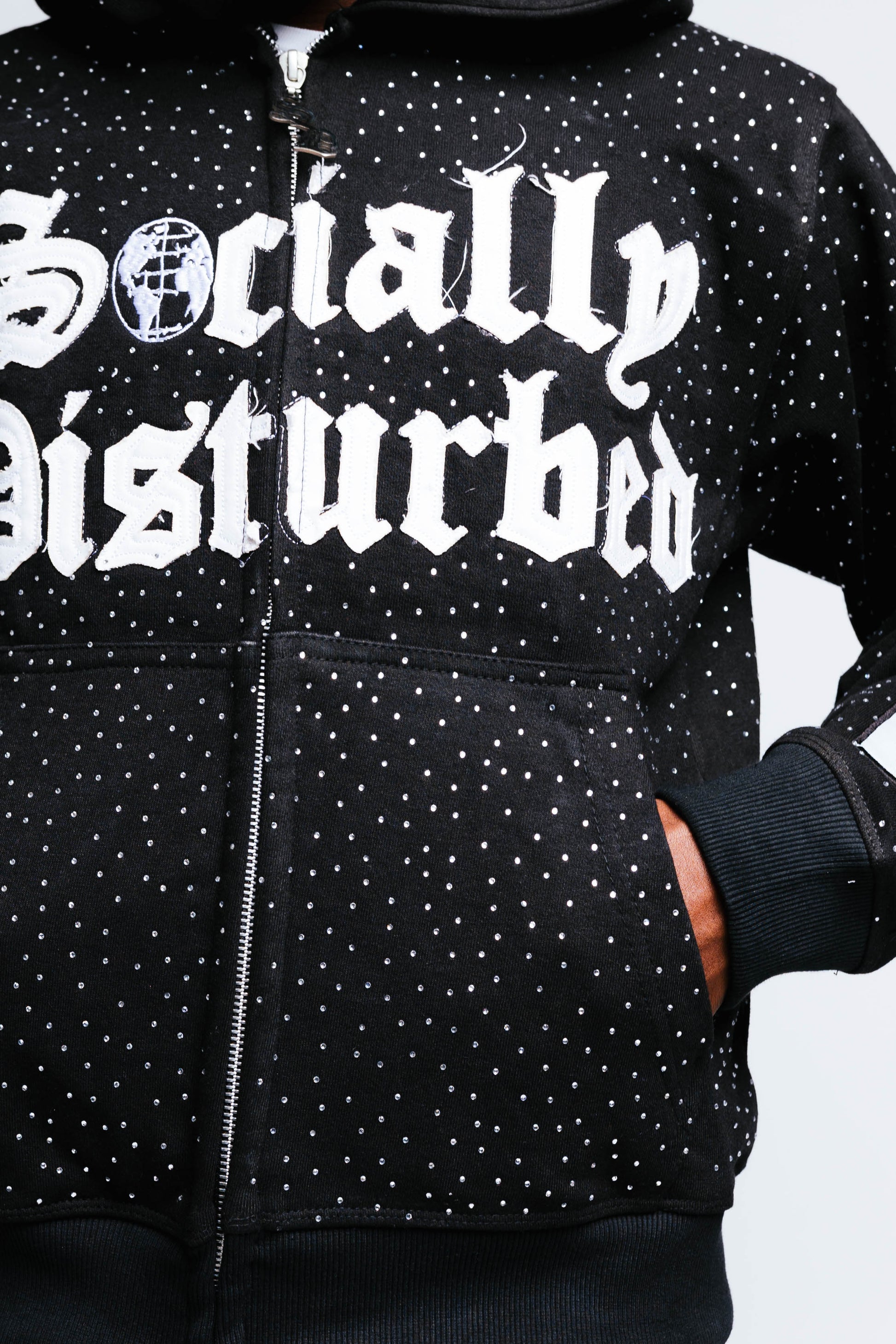 Step into bold luxury with our 12 OZ Rhinestone Hoodie, crafted from premium French Terry cotton for ultimate durability and comfort. Designed for those who embrace individuality, this heavyweight full-zip hoodie makes a statement with its "Socially Disturbed" gothic font, fully embellished with dazzling rhinestone detailing for a high-end, rebellious aesthetic.